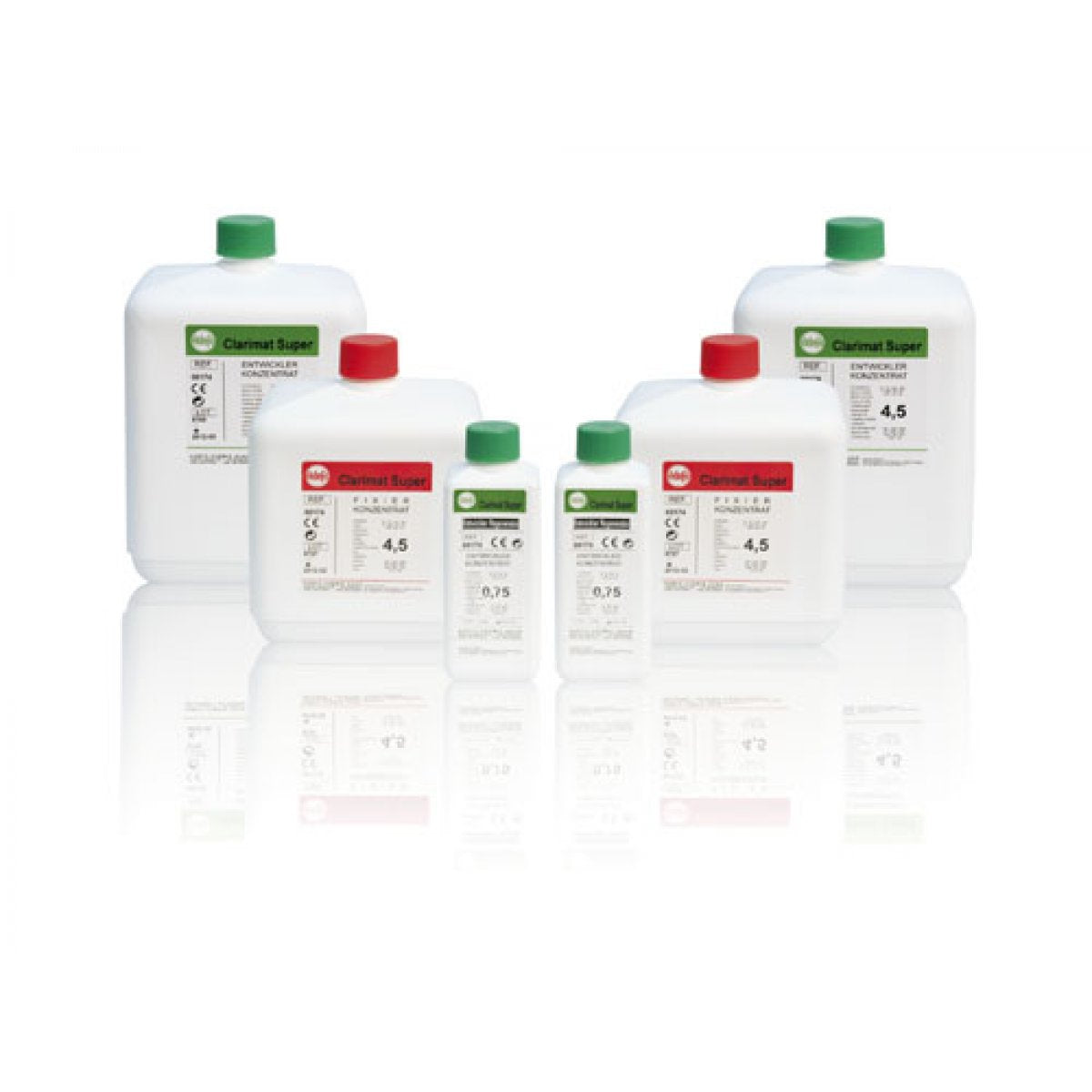 Combination pack 2 x 4.5 liters developer and fixer solution and for 2 x 0.75 liters developer replenisher. These Adefo special chemicals are tailored to the dental film developing machines Clarimat Super S2, S3 and Girardelli -X20, -X24.