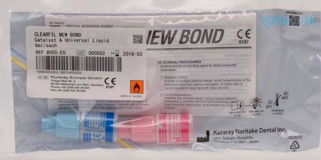 Pack of 2 x 6 ml CLEARFIL NEW BOND Catalyst/Universal CLEARFIL NEW BOND is a self-curing bonding agent for tooth enamel and dentin based on the total-etch technique. The substance was developed for use with self-curing composite restoration materials. When mixed with CLEARFIL PORCELAIN BOND ACTIVATOR, direct adhesion to ceramic can also be achieved.