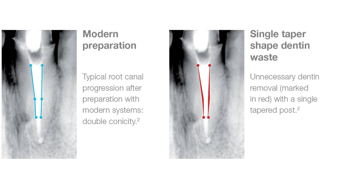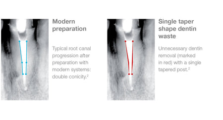 Endodontic double taper design corresponds to the anatomy of the tooth after root canal preparation, the result is tooth-friendly treatment and quick work through substance-friendly dentin removal