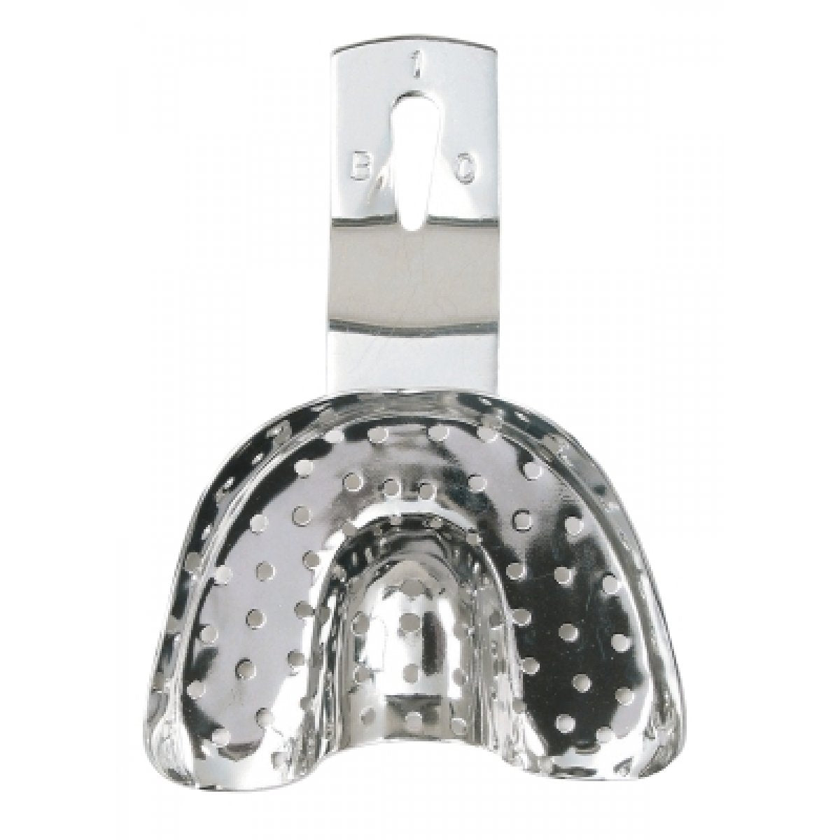 Piece OK size BO/1 5 shapes each for the upper (BO 0-4) and lower jaw (BU 0-4). Stable and torsion-resistant stainless steel material. Perforated - for perfect hold of the impression material. Rounded edges ensure an atraumatic impression. Electropolished - guarantees the highest possible corrosion resistance. Suitable for autoclave, thermal disinfection and ultrasonic cleaning (the manufacturer's guidelines must be followed exactly).