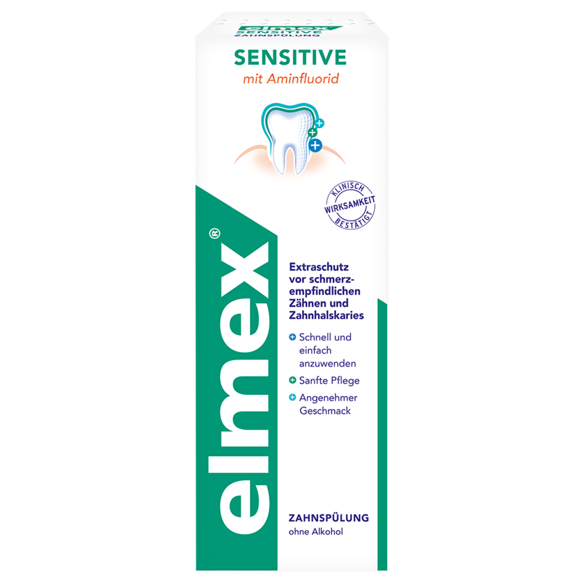 elmex SENSITIVE tooth rinse offers intensive protection against pain-sensitive teeth and cervical caries thanks to highly effective amine fluoride.
