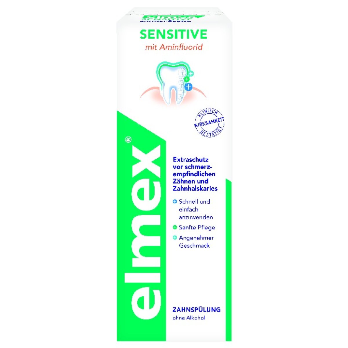 elmex SENSITIVE tooth rinse with amine fluoride offers intensive protection against pain-sensitive teeth and cervical caries. It closes open conductive channels and is free of alcohol and dyes.