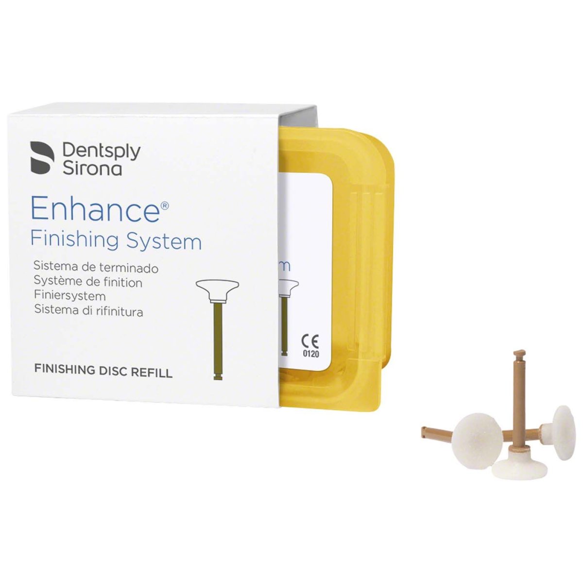 The single-use Enhance finishers (discs, cups, tips) are made of aluminum oxide-coated urethane dimethacrylate for finishing composite restorations in preparation for high-gloss polishing. Easy to use: The efficiency depends on the pressure applied, so there is no need to switch to different grain sizes. Since the disc and mandrel are made of one piece, there is no risk of discoloration or damage to the fillings.