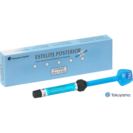 Light-curing, radiopaque sub-microfiller composite with excellent physical properties for long-lasting, durable restorations in the posterior region. Because of its extremely high bending and breaking strength, Estelite Posterior Quick is the safest and best choice for heavily stressed fillings in cavity classes I and II. The proportion of naturally yellowish camphorquinone is lower in Estelite Posterior Quick than in conventional posterior composites. Estelite Posterior Quick therefore has very good color adaptation and long-lasting color stability. Time-saving light curing in just 10 seconds thanks to patented RAP technology. 84% filler content. Manufacturer: Tokuyama Dental Corporation.