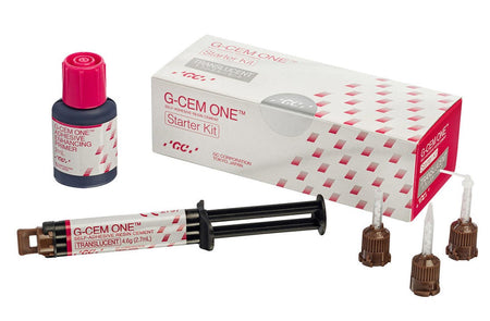 Sales unit: G-Cem One, underfill / fixing, color translucent, starter kit, syringe 1 set, scope of delivery: 1x syringe 4.6g, 8x Automix Tips Regular, 2x Automix Endo Tips, 1x G-Cem One Adhesive Enhancing Primer 2ml