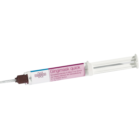 Quick-setting A-silicone for optimal protection of the gingiva during in-office bleaching. Gingimask quick is applied directly to the gums from the handy OptiMix syringe. The addition-curing gum mask can be applied quickly and easily to interdental spaces due to its low-viscosity consistency. Gingimask quick cures automatically in just 2 minutes. Time-consuming light polymerization, as with expensive, resin-based plastics, is no longer necessary. After bleaching therapy, Gingimask can be easily removed from the patient's mouth in one piece. Time and cost saving.