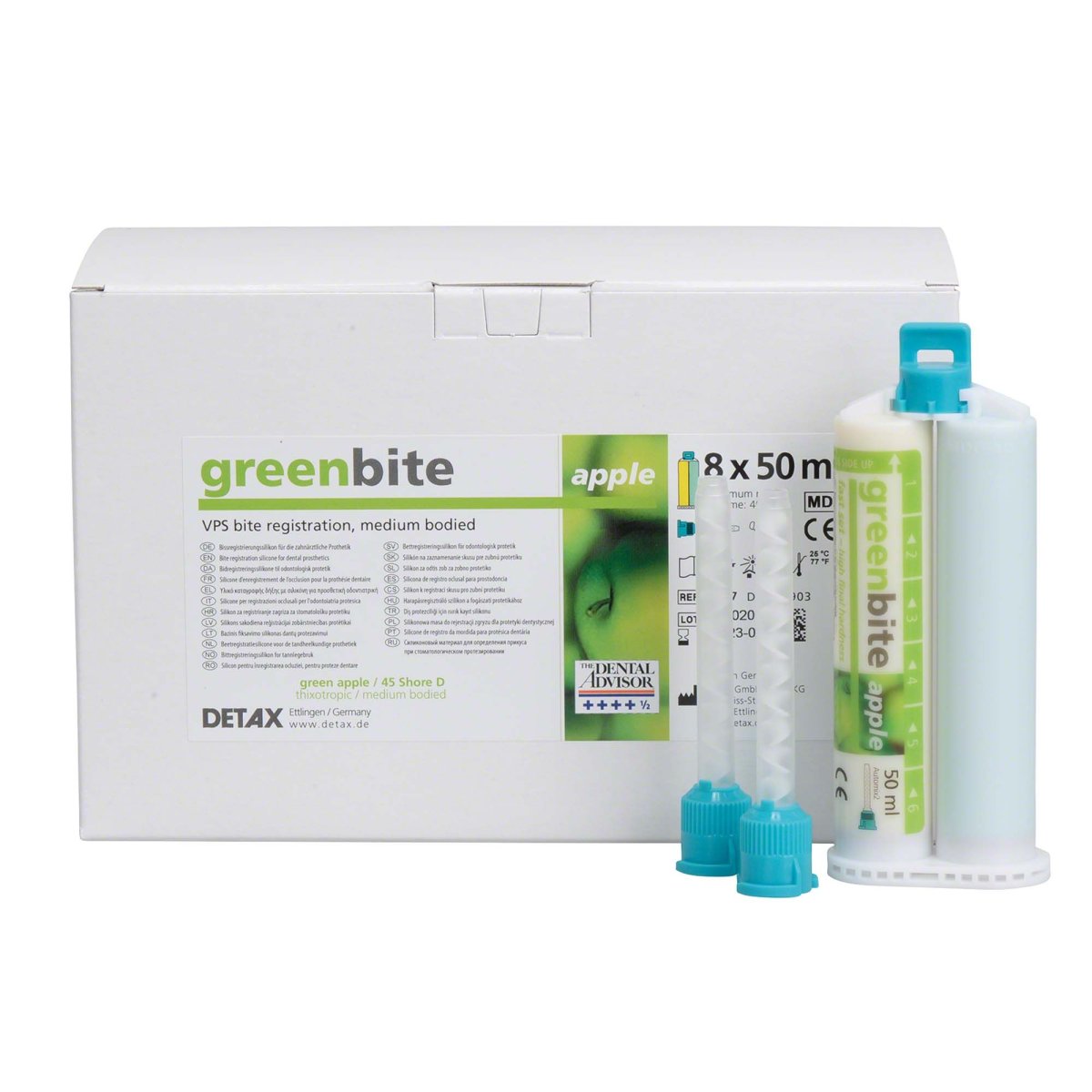 The delivery includes a pack of 8 double cartridges of 50 ml each, 32 mixing cannulas and 32 contouring nozzles.