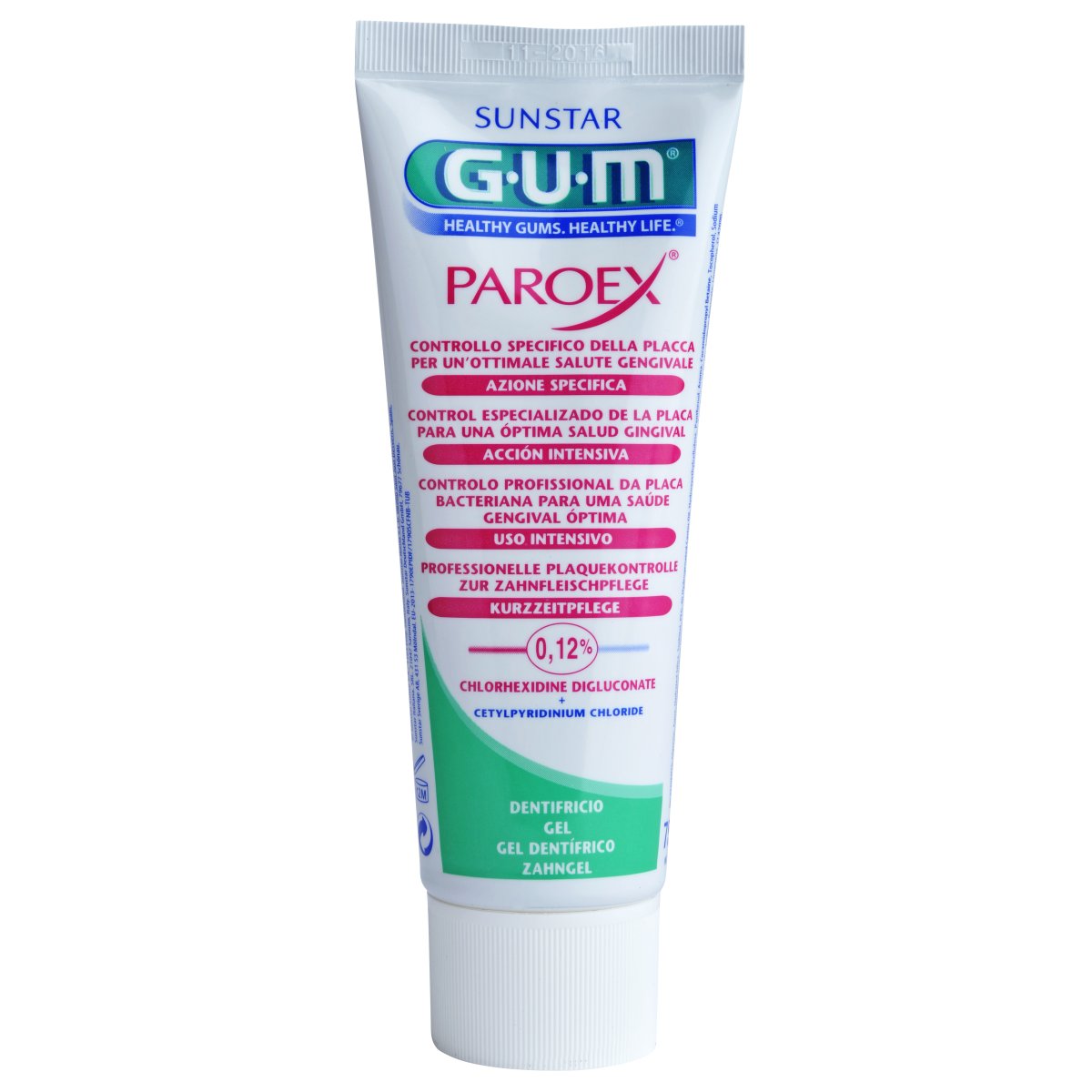 The GUM PAROEX 0.12% tooth gel for intensive care is suitable for the period after operations or tooth extractions. To brush your teeth after every meal with a soft toothbrush; at least twice a day for three minutes each time. Contains 0.12% chlorhexidine and additional 0.05% cetylpyridinium chloride. Vitamin E, aloe vera and provitamin B5 soothe and revitalize the gums. For an interval 2-week treatment for gum problems.