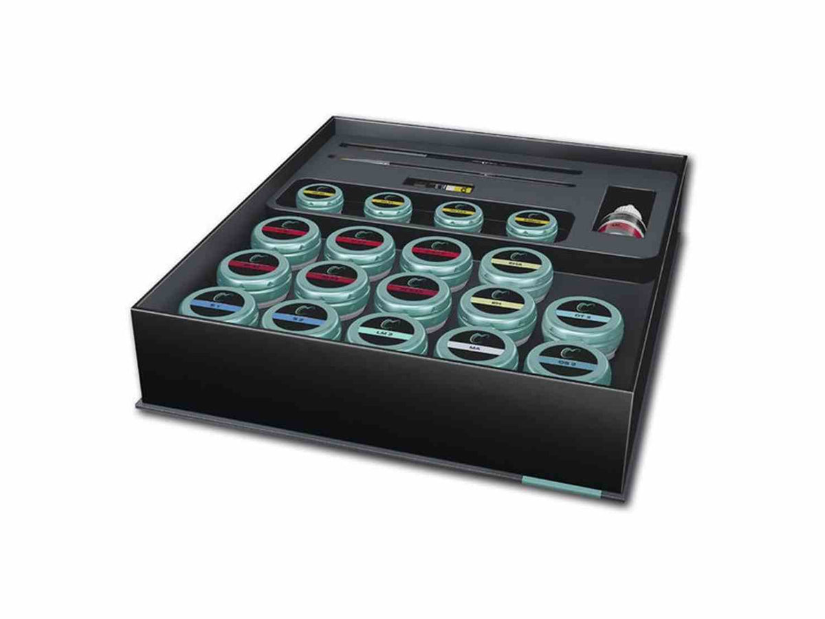 Set First touch 1 ml NP primer, 3 x 2 ml paste opaque PO (A2, A3, A3.5), 3 x 20 g dentin D (A2, A3, A3.5), 3 x 20 g increaser IN (A2, A3, A3.5) 2 x 20 g cutting edge S1 (S2I), 2 x 20 g enhancer EH (A, neutral), 20 g Mask MA bright, 2 x 20 g opal materials OS 2 (OT 2), 20 g shoulder material LM 2, 1 ml paste opaque liquid POL, 25 ml modeling fluid ML, paste opaque brush PO, modeling brush Toray, color indicator veneering ceramic with chipping protection. HeraCeram Zirconia is optimally matched to the framework material zirconium oxide and its CTE of 10.5 µm/mK. The paste-like HeraCeram Zirconia Adhesive was developed specifically for zirconium oxide veneering. It ensures the maximum bond between the veneering ceramic and the zirconium oxide framework without risky sandblasting of the sensitive zirconium oxide surface. The adhesive firing optimizes the wetting of the framework surface, cleans the framework and fluoresces it - for a vital glow from the depths.