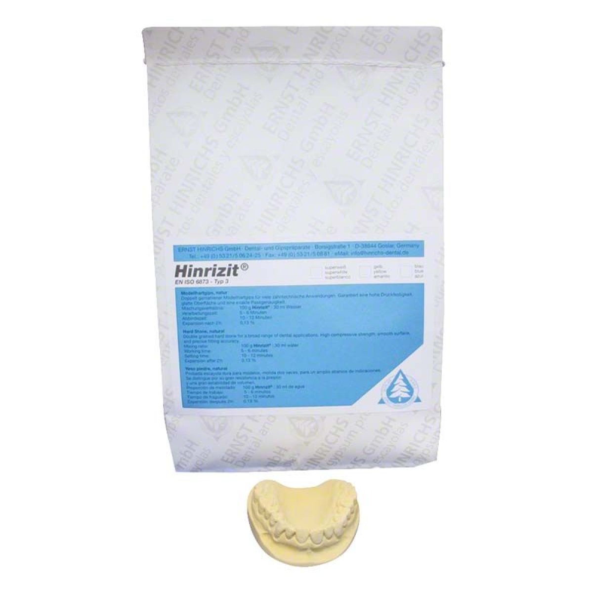 Class 3 hard plaster made from specially selected natural rock with permanent volume stability. High compressive strength, smooth surfaces and an exact fit. Hinrizit super white is particularly recommended for orthodontic work.