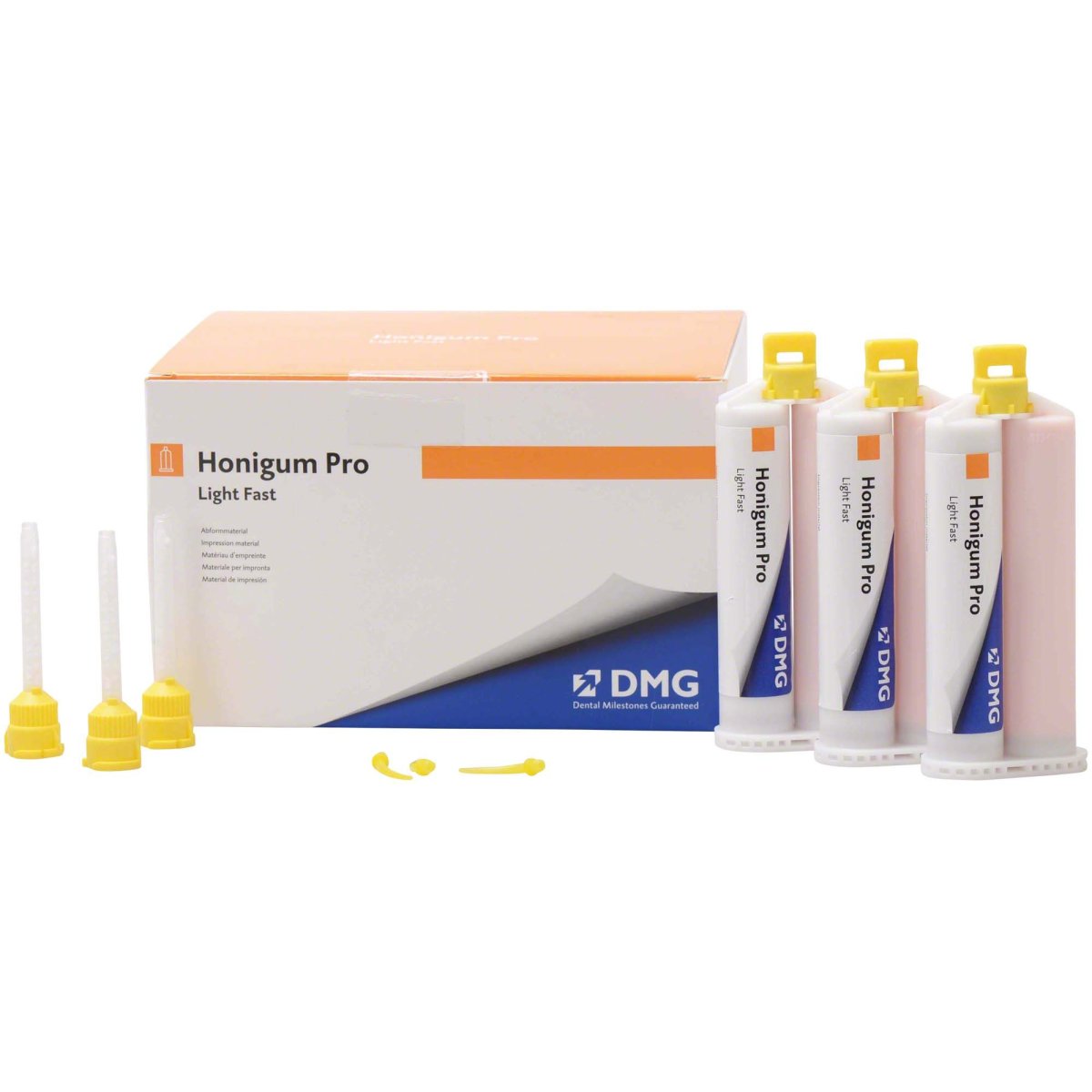 The delivery includes 8 double cartridges of 50 ml each, 40 automix tips and 40 intraoral tips.