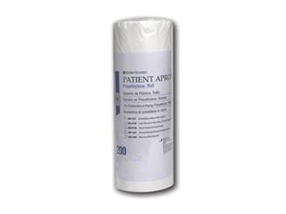Transparent patient gown on a roll made of PE film, with neckline and straps, suitable for standard patient gown roll dispensers. Color: white.