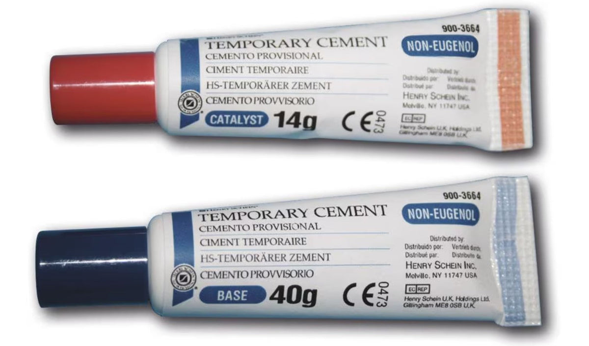 Temporary cement without eugenol is a low viscosity, polycarbonate-based temporary sealant and filler. It is intended for routine provisional restorations and does not affect resin adhesives. Packaging: 40 g base paste and 14 g catalyst.
