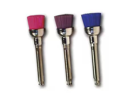 Latex-free miniature brush for tooth cleaning, mounted for contra-angle handpiece. Pink = soft, violet = medium, blue = hard.