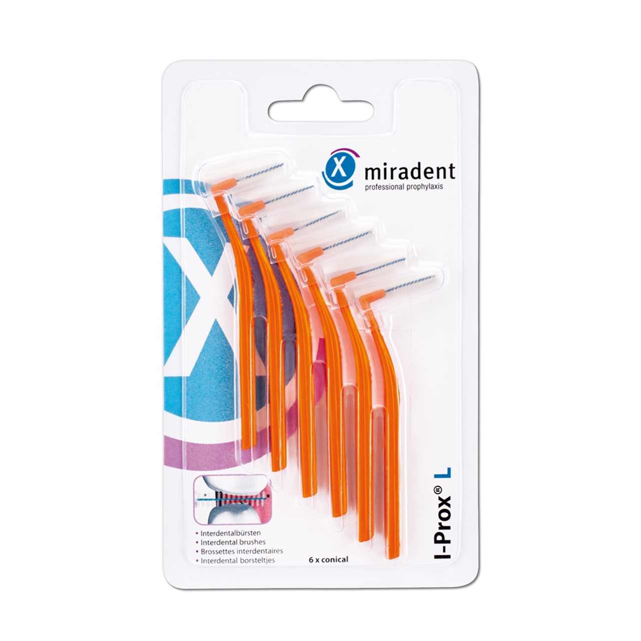 Pack of 6 brushes orange, Ø 2.5 mm - 5 mm, conical Interdental brushes Extended L-shaped handle and 60° angle make handling easier Hygienic protective cap Ideal for on the go Six sizes from xx-fine - large Color-coded Coated wire