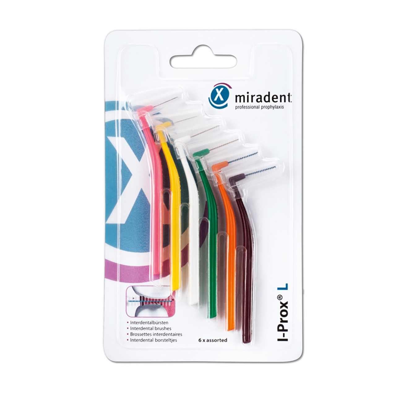 Pack of 6 brushes assorted interdental brushes Extended L-shaped handle and 60° angle make handling easier Hygienic protective cap Ideal for on the go Six sizes of xx-fine - large Color-coded coated wire