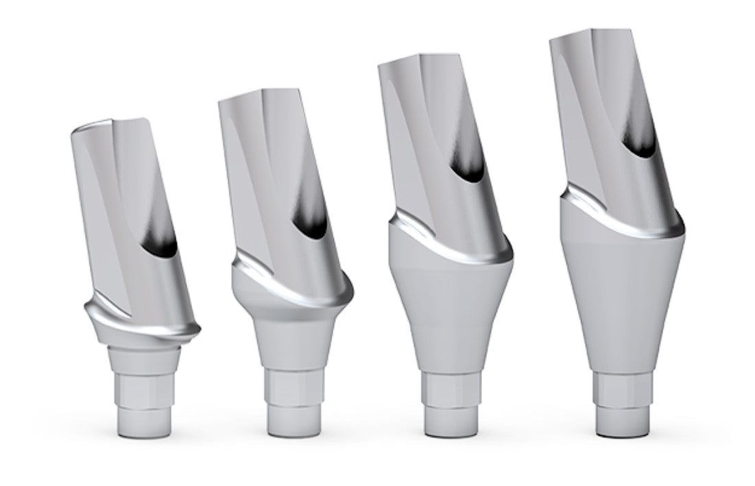 All aesthetic titanium abutments are angled over the surface of the hexagonal anti-rotation protection.