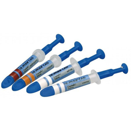 IPS e.max CAD Crystallization Stains are usable stains in syringes. For customizing translucent IPS e.max CAD blocks for dies with little or no discoloration.