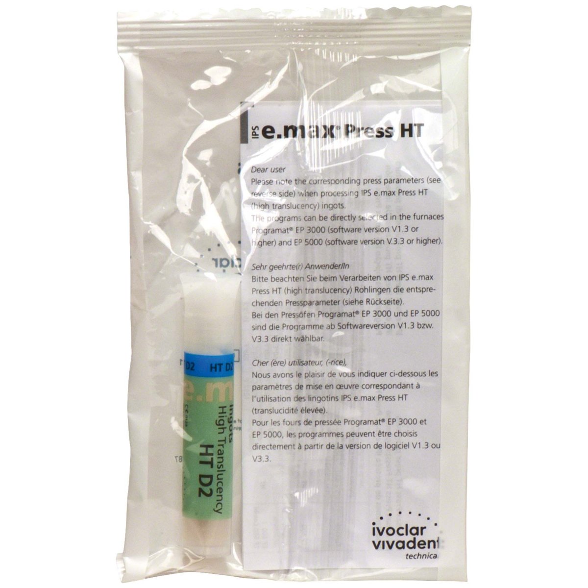 IPS e.max Press HT - blanks with high translucency (HT) are used for pressing high-strength, aesthetic inlays and veneers. IPS e.max Press LT - blanks with low translucency (LT) are used for pressing fully anatomical crowns and bridges.