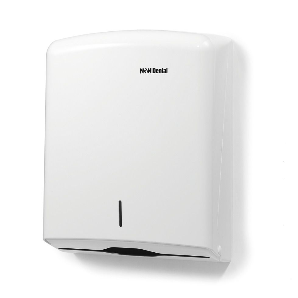 Lockable folded towel dispenser made of white plastic with a viewing window. Holds up to 600 paper towels. Can be used for all towels with C and zigzag folds as well as interfold folds (adapter optionally available). Dimensions: H 36.5 x W 27.6 x D 13.0 cm.