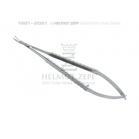 Micro spring scissors, with micro serration ZEPF line pointed/pointed curved, 18 cm with holding function for suture removal