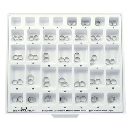 Universally applicable for the right and left jaw halves Unwelded bands (with and without double hooks) Ideally suited for the Herbst technique (free double band welding service on request) Secure hold and optimal adhesion due to rough inner band surface Delivered in a tray (suitable for assortment cabinet REF 890-414-00) To determine the largest mesio-distal diameter of the tooth crown, we recommend our dental caliper (REF 042-751-00).