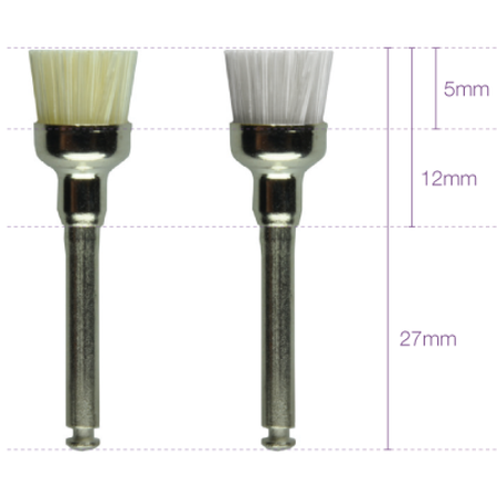 The miniature polishing brush is the smallest form of this brush type. The polishing paste is applied to the prophylactic brush and then used to clean and polish natural teeth as well as glass ionomer, composite or metal fillings.