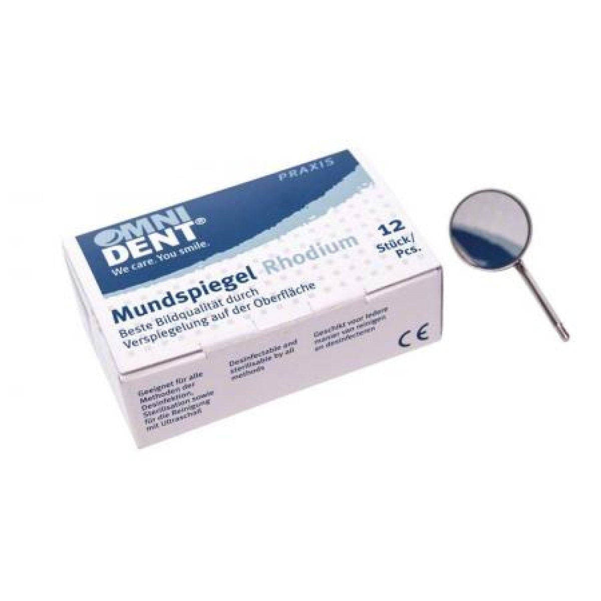 Pack of 12 mouth mirrors rhodium No. 4 magnifying 22 mm OMNIDENT mouth mirror standard: Special silver-titanium coating for extremely long durability. High reflection for best mirror quality. Made of stainless steel. Can be sterilized and disinfected. OMNIDENT mouth mirror rhodium: Absolutely sharp mirror image and therefore the best image quality thanks to surface sealing, as the reflection/mirroring takes place directly on the surface. Made of stainless steel. Can be sterilized and disinfected. Rhodium as a precious metal is also resistant to acidic solutions (e.g. Neodisher N).