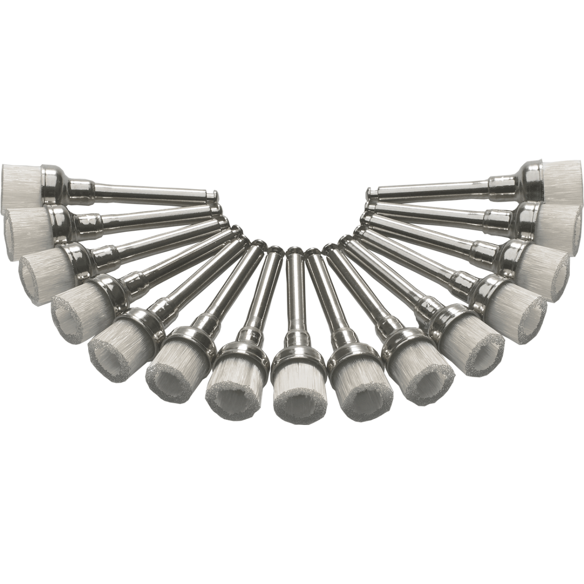 Disposable prophylactic brushes with nylon brush head for professional tooth cleaning. With pre-assembled metal shaft. Suitable for standard angle pieces.