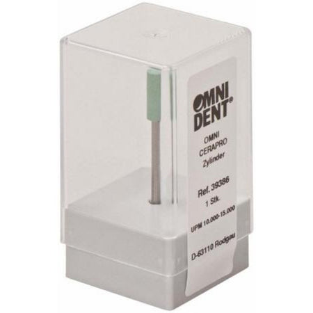 Piece cylinder, length 13 mm, Ø 5 mm Omni CeraPro wheel - grinding the attachment points. Sintered diamond with organic bond, for processing ceramics and metals, enables coarse grinding without heating the object. Suitable for coarse grinding and grinding the casting channels of pressed ceramics. Omni CeraPro cone, cylinder - reworking the surfaces / pre-contouring. Abrasive trimmer with natural diamond grain. Ideal for pre-contouring and finishing without heating the object. Suitable for processing larger vestibular and oral surfaces made of ceramic, full ceramic and zirconium oxide. 10,000-15,000 rpm, ISO 104.