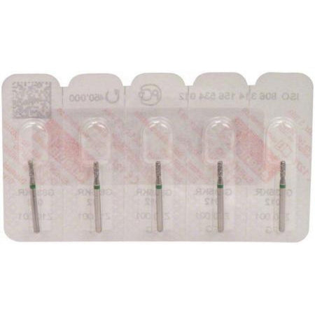 Pack of 5 diamonds green ISO 012 Diamond instruments consist of the shaft and a hardened, rust-proof profile body, which is coated with only selected natural diamonds using the latest electroplating technology. This guarantees extremely homogeneous, safe and sustainable diamond coating of the instruments and thus optimal work results. This is also guaranteed by the user's ability to choose from up to seven different grain sizes. Black = super coarse Coarse pre-grinding. Green = coarse Pre-grinding. Blue = medium Universal grinding. Red = fine Smoothing. Yellow = extra fine Pre-finishing of composites.