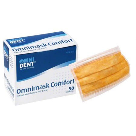 Pack of 50 orange masks with band The new Omnident face mask, ideal for daily use by professionals. Equipped with soft, lightweight cellular fabric, specially designed for sensitive skin to avoid skin irritation. The entire face mask is latex and fiberglass free. The bacterial filtration is > 98%, the respiratory resistance is < 5. Produced according to 39/42/EC, Class I, CE, EN14683 type IIR. Made in France.