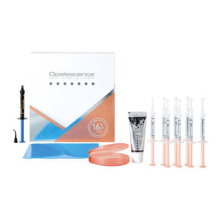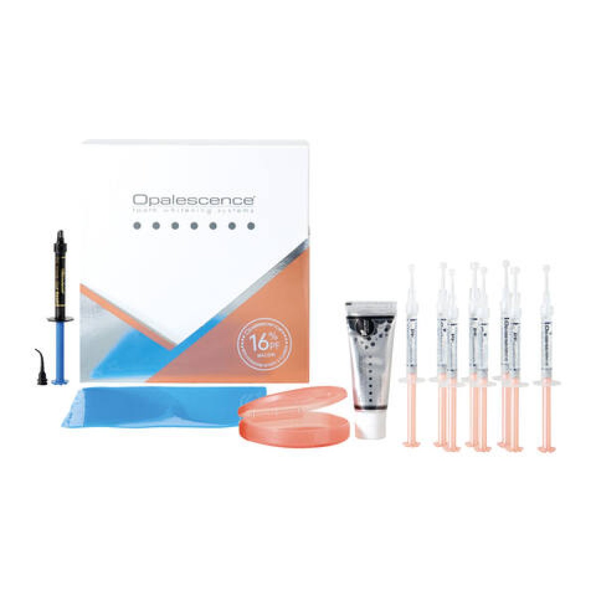The scope of delivery includes 8 syringes of 16% melon, 1.2 ml each, 2 Sof-Tray foils 0.9 mm, 1 Color key, 1 storage box, LC Block-Out Resin à 1.2 ml, Opalescence toothpaste à 20 ml and 1 Black Mini Tip.