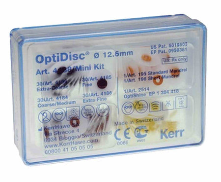 30 discs each 12.6 mm coarse, coarse/medium, fine, x-fine, 1 mandrel, 1 Optishine polishing brush