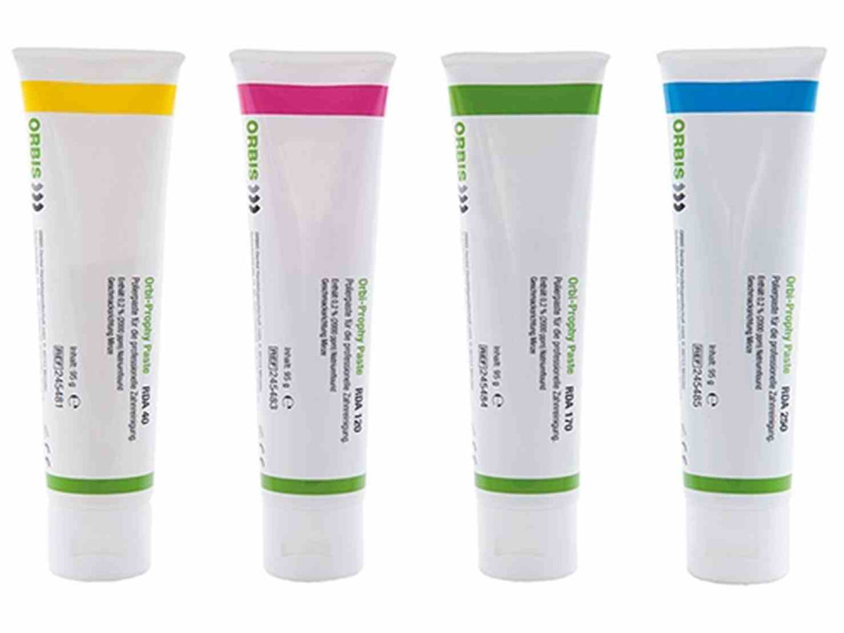 ORBI-Prophy Paste polishing pastes for professional tooth cleaning. * Contains 0.2% sodium fluoride * Flavor: mint To be used with tooth cleaning and polishing brushes, REF 193090 and REF 243106) and Orbi-Prophylase polishers REF 245661 and REF 245662.