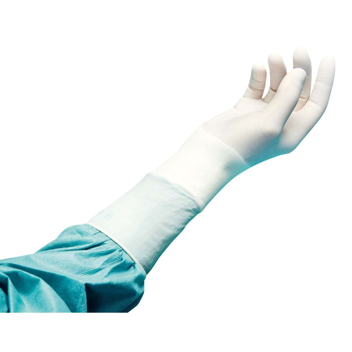 Powder-free latex disposable surgical gloves made of thin and particularly soft latex, particularly easy to put on thanks to the special polymer inner coating.