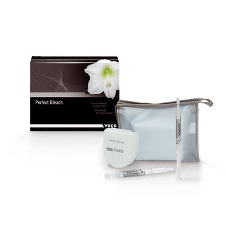 Home bleaching system for the gentle, permanent whitening of vital teeth with internal or external discoloration or stains caused by aging, mineralization disorders or the incorporation of dyes (e.g. from coffee or nicotine consumption). Voco Perfect Bleach contains 10% carbamide peroxide, which ensures thorough oxidation of the embedded dyes and does not attack tooth structure or existing restorations.