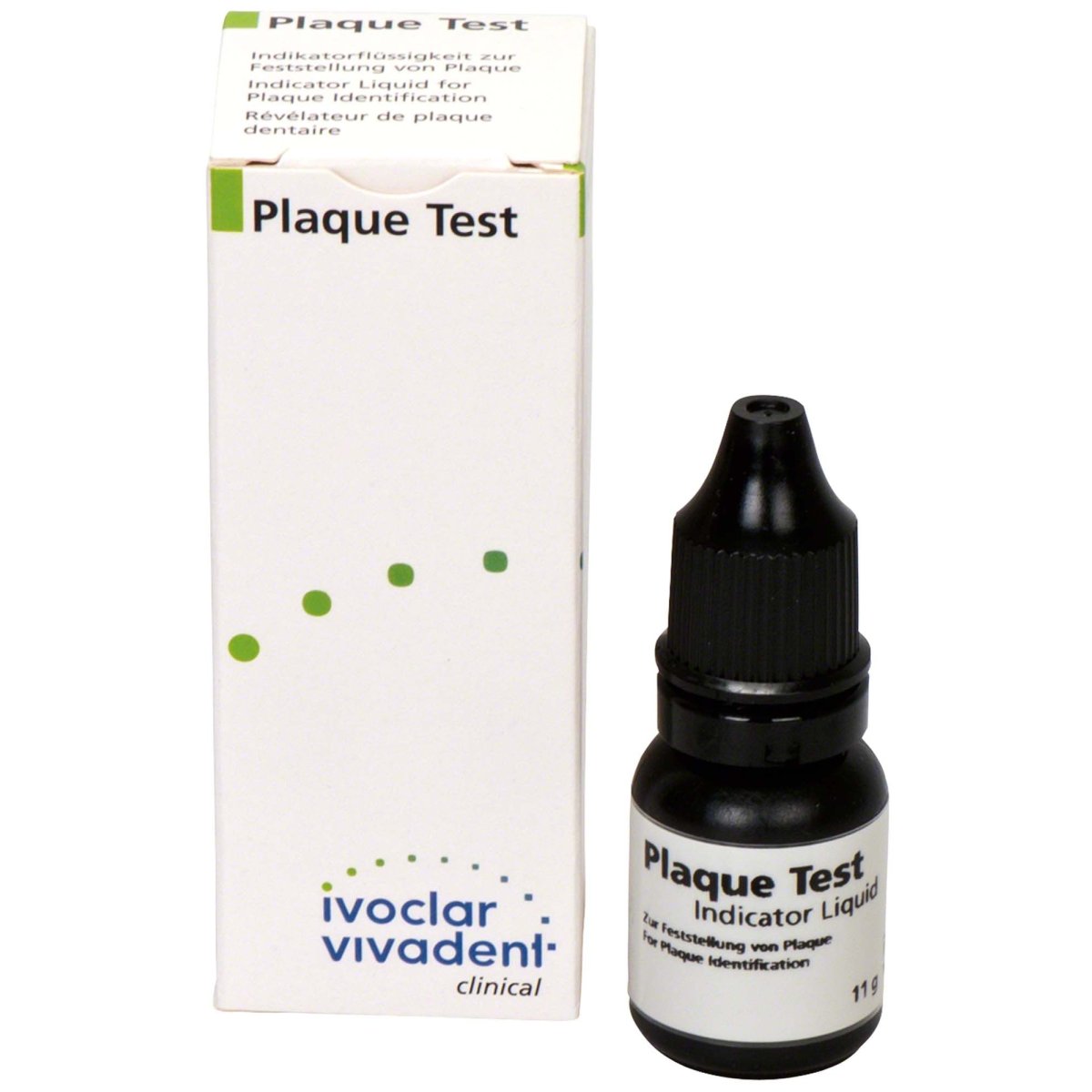 Indicator liquid for visualizing plaque on tooth surfaces. When irradiated with a polymerization lamp, existing plaque fluoresces yellow after being coated with Plaque Test.