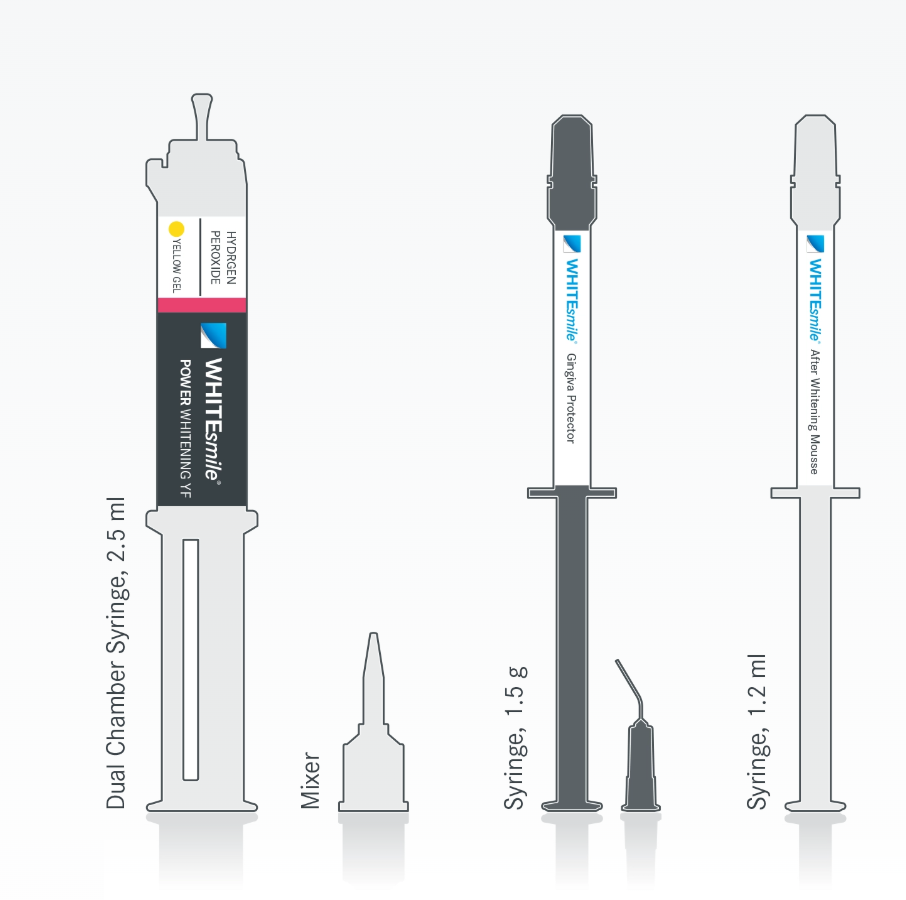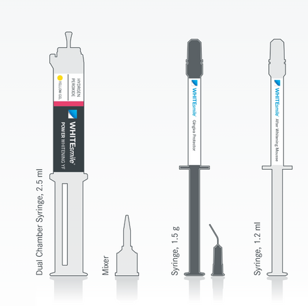 Scope of delivery: * 2 x 2.5 ml Power Whitening 40% HP yellow * 3 g Gingiva Protector * 3 ml After Whitening Mousse.