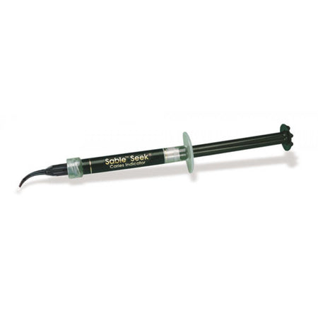 Sable Seek caries indicator, dark green. Contains FD&C (Food, Drug & Cosmetic) color in a glycol-containing solution that stains carious dentin green. The green color in particular enables clear differentiation of any pulpal bleeding. There is a clear marking even in deep preparations. Also for detecting root canal entrances on the pulp chamber floor.
