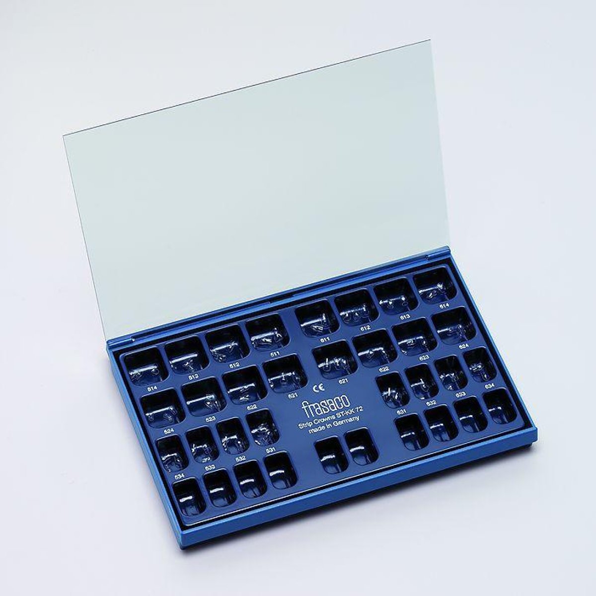 Assortment 84 crowns, 3 crowns of one size OK 511-514, OK 521-524, OK 531-534, OK 611-614, OK 621-624, OK 631-634 Frasaco strip crowns are thin, elastic, easy to trim and in clear design, translucent to polymerization light. They serve as a shaper, the temporary restoration of ground teeth, the protection of large fillings and as a matrix for corner and edge build-ups. The placement is done using the usual temporary filling materials.