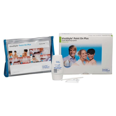 VivaStyle Paint On Plus, the paint system for whitening teeth in the practice and at home. VivaStyle Paint On Plus with 6% hydrogen peroxide is applied directly to the teeth with a brush. The paint system does not dissolve in saliva and takes effect within a few minutes. Both individual teeth and the entire row of teeth can be whitened. In the dentist's practice, VivaStyle Paint On Plus can be used for intensive treatment by applying it multiple times in one session.